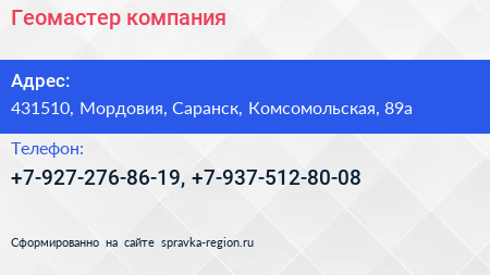 Геомастер, компания по адресу 431510, Мордовия, Саранск, Комсомольская, 89а в дальнейшем Организация, размещена в следующих категориях: