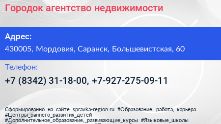 Городок, агентство недвижимости по адресу 430005, Мордовия, Саранск, Большевистская, 60 в дальнейшем Организация, размещена в следующих категориях: