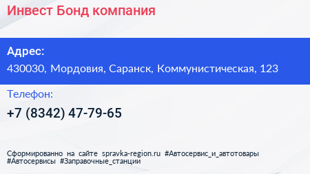 Инвест–Бонд, компания по адресу 430030, Мордовия, Саранск, Коммунистическая, 123 в дальнейшем Организация, размещена в следующих категориях: