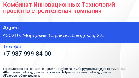 Комбинат Инновационных Технологий, проектно-строительная компания по адресу 430910, Мордовия, Саранск, Заводская, 22а в дальнейшем Организация, размещена в следующих категориях: