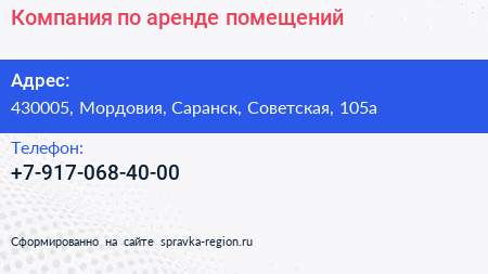 Компания по аренде помещений по адресу 430005, Мордовия, Саранск, Советская, 105а в дальнейшем Организация, размещена в следующих категориях: