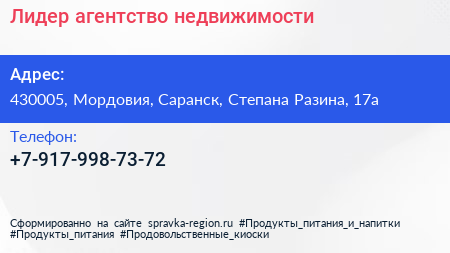 Лидер, агентство недвижимости по адресу 430005, Мордовия, Саранск, Степана Разина, 17а в дальнейшем Организация, размещена в следующих категориях: