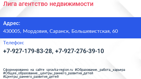 Лига, агентство недвижимости по адресу 430005, Мордовия, Саранск, Большевистская, 60 в дальнейшем Организация, размещена в следующих категориях: