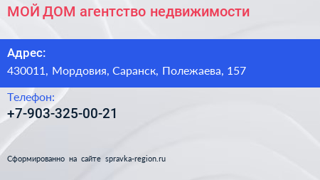 МОЙ ДОМ, агентство недвижимости по адресу 430011, Мордовия, Саранск, Полежаева, 157 в дальнейшем Организация, размещена в следующих категориях: