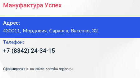 Мануфактура Успех по адресу 430011, Мордовия, Саранск, Васенко, 32 в дальнейшем Организация, размещена в следующих категориях: