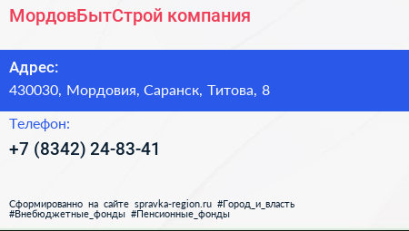 МордовБытСтрой, компания по адресу 430030, Мордовия, Саранск, Титова, 8 в дальнейшем Организация, размещена в следующих категориях: