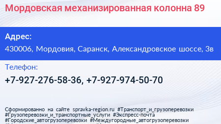 Мордовская механизированная колонна №89 по адресу 430006, Мордовия, Саранск, Александровское шоссе, 3в в дальнейшем Организация, размещена в следующих категориях: