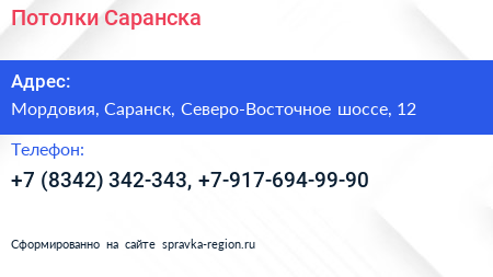 Потолки Саранска по адресу Мордовия, Саранск, Северо-Восточное шоссе, 12 в дальнейшем Организация, размещена в следующих категориях: