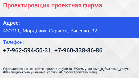 Проектировщик, проектная фирма по адресу 430011, Мордовия, Саранск, Васенко, 32 в дальнейшем Организация, размещена в следующих категориях: