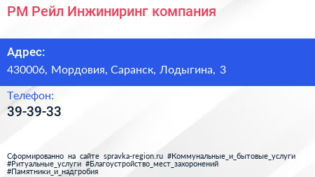 РМ Рейл Инжиниринг, компания по адресу 430006, Мордовия, Саранск, Лодыгина, 3 в дальнейшем Организация, размещена в следующих категориях: