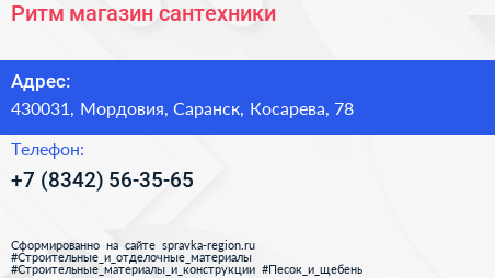 Ритм, магазин сантехники по адресу 430031, Мордовия, Саранск, Косарева, 78 в дальнейшем Организация, размещена в следующих категориях:
