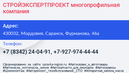 СТРОЙЭКСПЕРТПРОЕКТ, многопрофильная компания по адресу 430032, Мордовия, Саранск, Фурманова, 46а в дальнейшем Организация, размещена в следующих категориях: