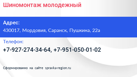 Шиномонтаж молодежный по адресу 430017, Мордовия, Саранск, Пушкина, 22а в дальнейшем Организация, размещена в следующих категориях: