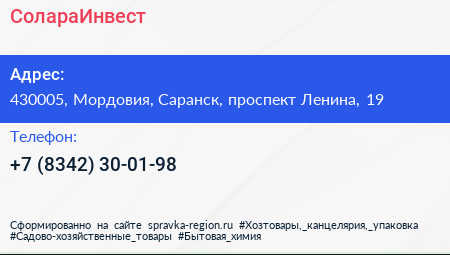 СолараИнвест по адресу 430005, Мордовия, Саранск, проспект Ленина, 19 в дальнейшем Организация, размещена в следующих категориях: