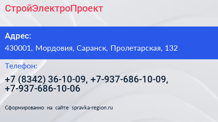 СтройЭлектроПроект по адресу 430001, Мордовия, Саранск, Пролетарская, 132 в дальнейшем Организация, размещена в следующих категориях: