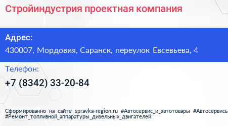 Стройиндустрия, проектная компания по адресу 430007, Мордовия, Саранск, переулок Евсевьева, 4 в дальнейшем Организация, размещена в следующих категориях: