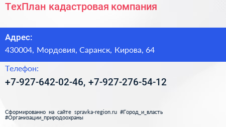 ТехПлан, кадастровая компания по адресу 430004, Мордовия, Саранск, Кирова, 64 в дальнейшем Организация, размещена в следующих категориях: