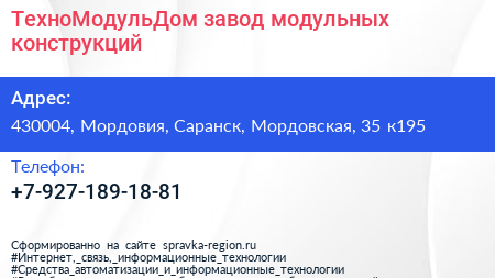 ТехноМодульДом, завод модульных конструкций по адресу 430004, Мордовия, Саранск, Мордовская, 35 к195 в дальнейшем Организация, размещена в следующих категориях: