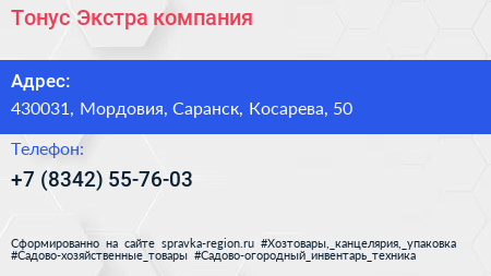 Тонус-Экстра, компания по адресу 430031, Мордовия, Саранск, Косарева, 50 в дальнейшем Организация, размещена в следующих категориях: