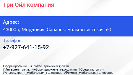 Три-Ойл, компания по адресу 430005, Мордовия, Саранск, Большевистская, 60 в дальнейшем Организация, размещена в следующих категориях: