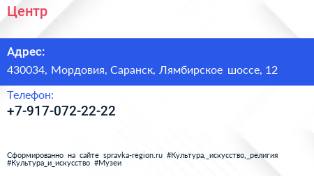 Центр по адресу 430034, Мордовия, Саранск, Лямбирское шоссе, 12 в дальнейшем Организация, размещена в следующих категориях: