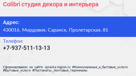 Colibri, студия декора и интерьера по адресу 430016, Мордовия, Саранск, Пролетарская, 81 в дальнейшем Организация, размещена в следующих категориях: