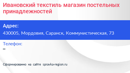 Ивановский текстиль, магазин постельных принадлежностей по адресу 430005, Мордовия, Саранск, Коммунистическая, 73 в дальнейшем Организация, размещена в следующих категориях: