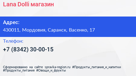 Lana Dolli, магазин по адресу 430011, Мордовия, Саранск, Васенко, 17 в дальнейшем Организация, размещена в следующих категориях: