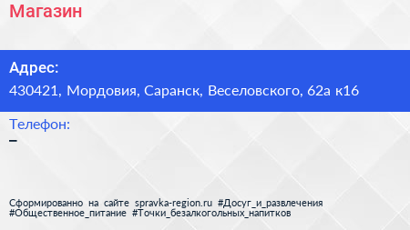 Магазин по адресу 430421, Мордовия, Саранск, Веселовского, 62а к16 в дальнейшем Организация, размещена в следующих категориях: