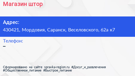 Магазин штор по адресу 430421, Мордовия, Саранск, Веселовского, 62а к7 в дальнейшем Организация, размещена в следующих категориях: