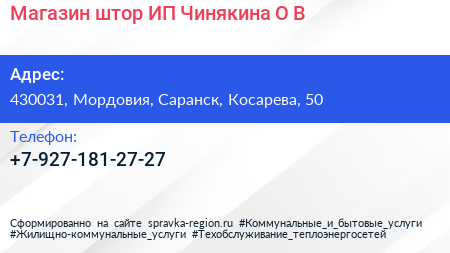 Магазин штор, ИП Чинякина О.В. по адресу 430031, Мордовия, Саранск, Косарева, 50 в дальнейшем Организация, размещена в следующих категориях: