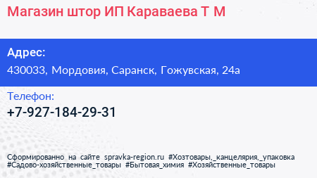 Магазин штор, ИП Караваева Т.М. по адресу 430033, Мордовия, Саранск, Гожувская, 24а в дальнейшем Организация, размещена в следующих категориях:
