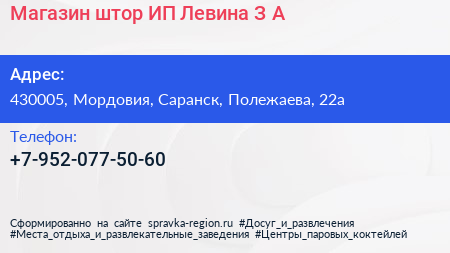 Магазин штор, ИП Левина З.А. по адресу 430005, Мордовия, Саранск, Полежаева, 22а в дальнейшем Организация, размещена в следующих категориях: