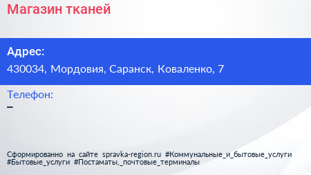 Магазин тканей по адресу 430034, Мордовия, Саранск, Коваленко, 7 в дальнейшем Организация, размещена в следующих категориях: