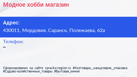 Модное хобби, магазин по адресу 430011, Мордовия, Саранск, Полежаева, 62а в дальнейшем Организация, размещена в следующих категориях: