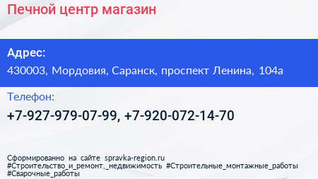 Печной центр, магазин по адресу 430003, Мордовия, Саранск, проспект Ленина, 104а в дальнейшем Организация, размещена в следующих категориях: