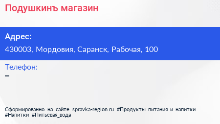 Подушкинъ, магазин по адресу 430003, Мордовия, Саранск, Рабочая, 100 в дальнейшем Организация, размещена в следующих категориях: