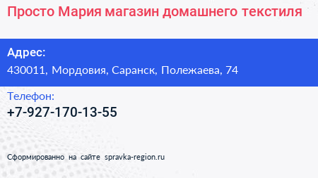 Просто Мария, магазин домашнего текстиля по адресу 430011, Мордовия, Саранск, Полежаева, 74 в дальнейшем Организация, размещена в следующих категориях: