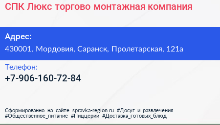 СПК-Люкс, торгово-монтажная компания по адресу 430001, Мордовия, Саранск, Пролетарская, 121а в дальнейшем Организация, размещена в следующих категориях: