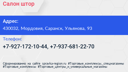 Салон штор по адресу 430032, Мордовия, Саранск, Ульянова, 93 в дальнейшем Организация, размещена в следующих категориях: