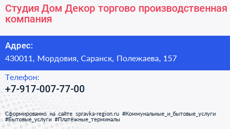 Студия Дом Декор, торгово-производственная компания по адресу 430011, Мордовия, Саранск, Полежаева, 157 в дальнейшем Организация, размещена в следующих категориях: