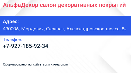 АльфаДекор, салон декоративных покрытий по адресу 430006, Мордовия, Саранск, Александровское шоссе, 8а в дальнейшем Организация, размещена в следующих категориях: