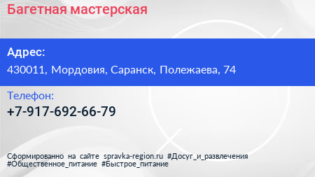 Багетная мастерская по адресу 430011, Мордовия, Саранск, Полежаева, 74 в дальнейшем Организация, размещена в следующих категориях: