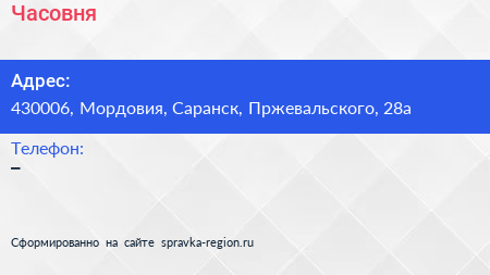 Часовня по адресу 430006, Мордовия, Саранск, Пржевальского, 28а в дальнейшем Организация, размещена в следующих категориях: