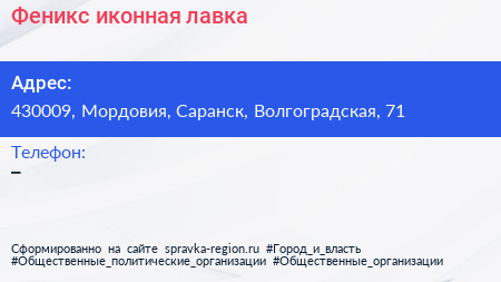 Феникс, иконная лавка по адресу 430009, Мордовия, Саранск, Волгоградская, 71 в дальнейшем Организация, размещена в следующих категориях: