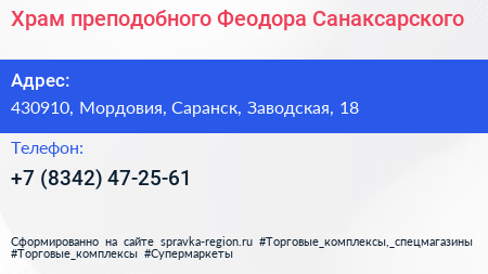 Храм преподобного Феодора Санаксарского по адресу 430910, Мордовия, Саранск, Заводская, 18 в дальнейшем Организация, размещена в следующих категориях: