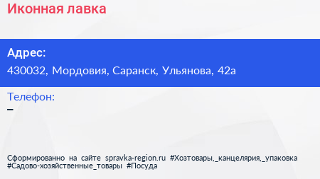 Иконная лавка по адресу 430032, Мордовия, Саранск, Ульянова, 42а в дальнейшем Организация, размещена в следующих категориях: