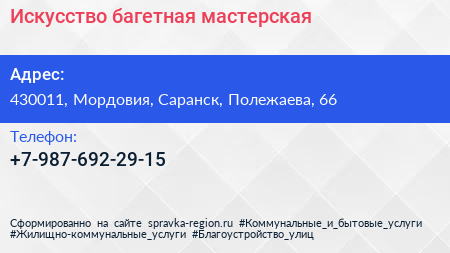 Искусство, багетная мастерская по адресу 430011, Мордовия, Саранск, Полежаева, 66 в дальнейшем Организация, размещена в следующих категориях: