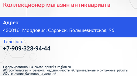Коллекционер, магазин антиквариата по адресу 430016, Мордовия, Саранск, Большевистская, 96 в дальнейшем Организация, размещена в следующих категориях: