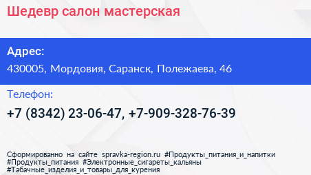 Шедевр, салон-мастерская по адресу 430005, Мордовия, Саранск, Полежаева, 46 в дальнейшем Организация, размещена в следующих категориях: